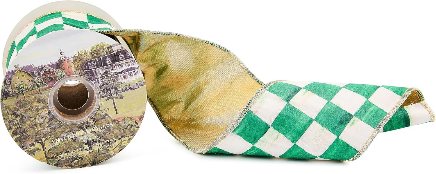 MACKENZIE-CHILDS Ribbon, Decorative Wired Ribbon for Christmas Gift Wrapping and Decor, 4 Inches, Brown-and-White Mocha Check Suede(Green Check)