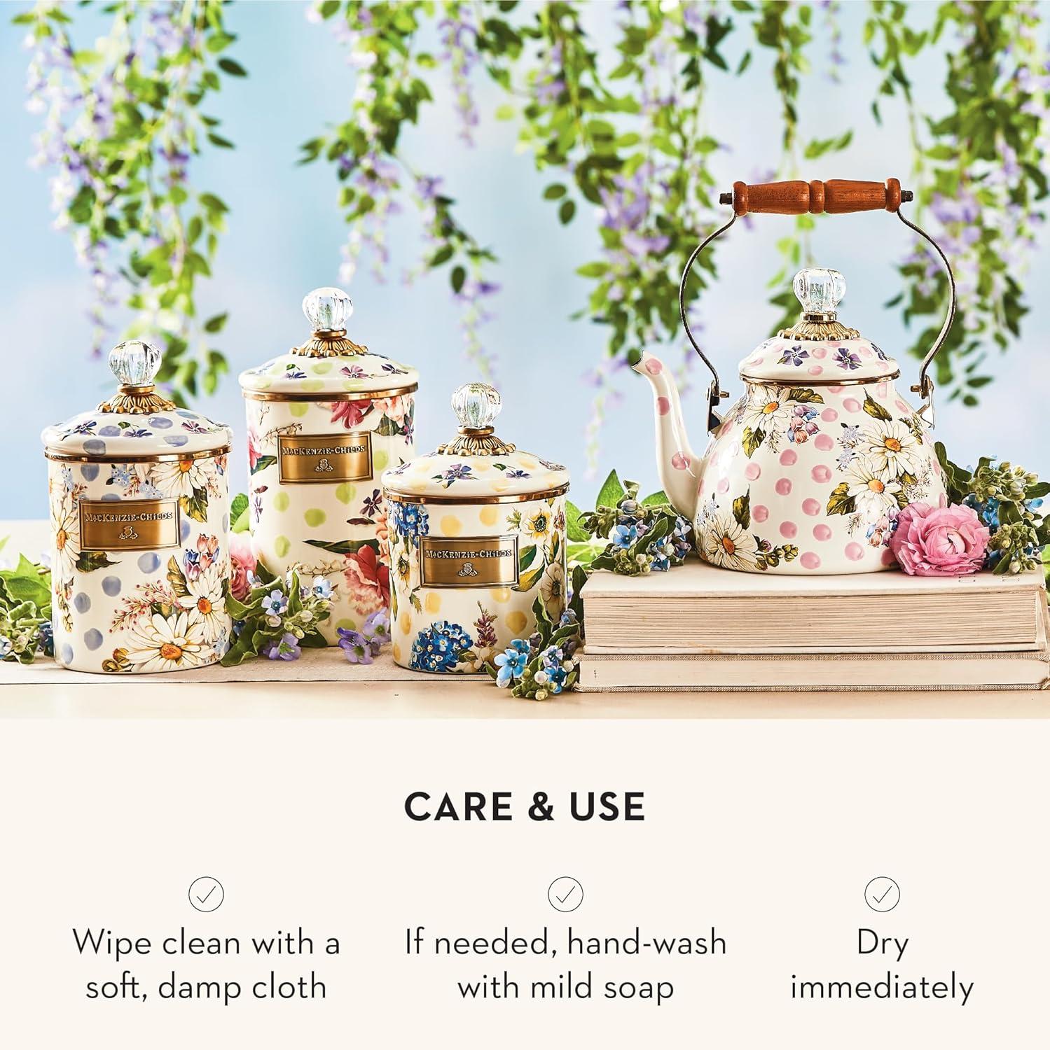 MACKENZIE-CHILDS Wildflowers Enamel Canister, Floral Kitchen Storage Container with Lid, Medium(White Wild Rose)