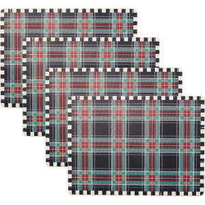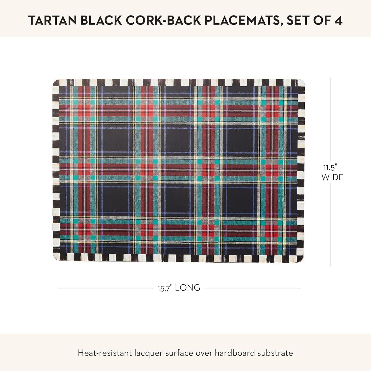 MACKENZIE-CHILDS Set of 4 Cork-Back Placemats, Hard-Finish Table Mats, Courtly Flower Market(Black Tartan)