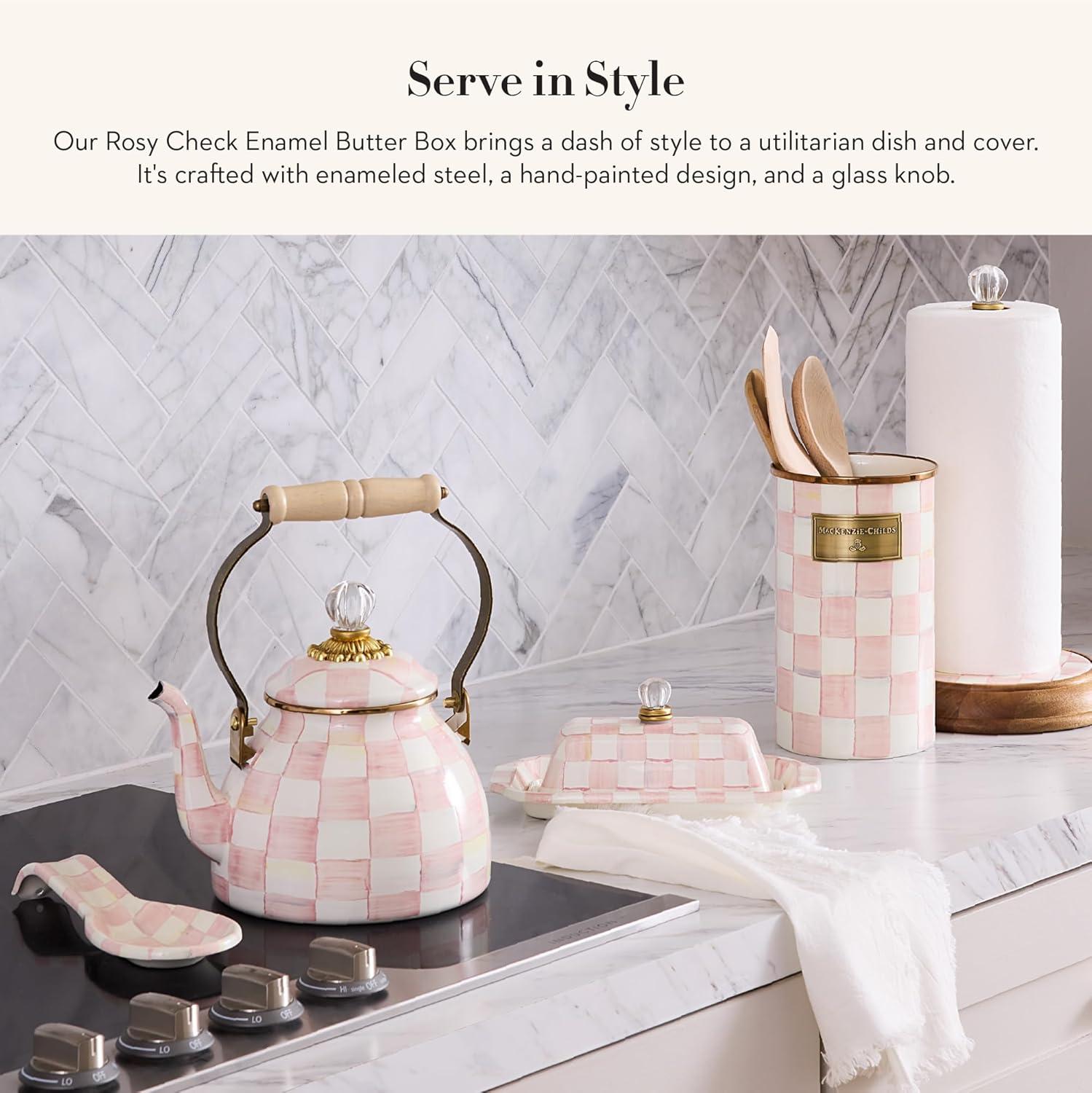 MACKENZIE-CHILDS Enamel Butter Box, Cute Lidded Butter Dish, Black-and-White Courtly Check(Rosy Check)