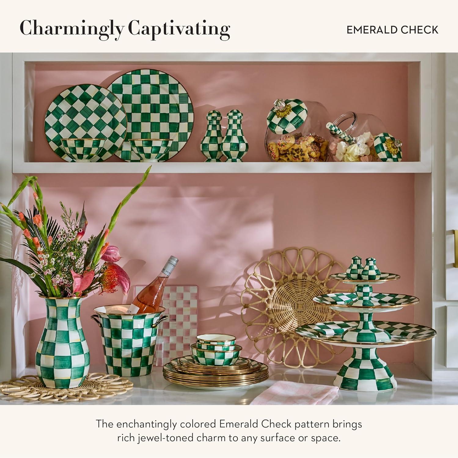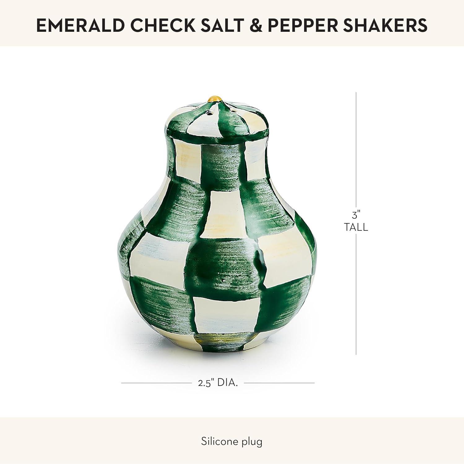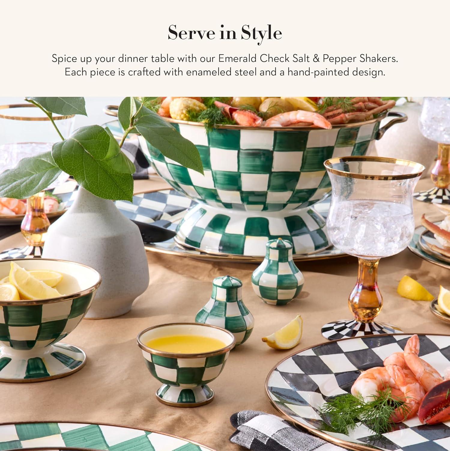 MACKENZIE-CHILDS Enamel Salt and Pepper Shakers, Kitchen Table Spice Shaker Set, Blue-and-White Royal Check, Small(Emerald Check)