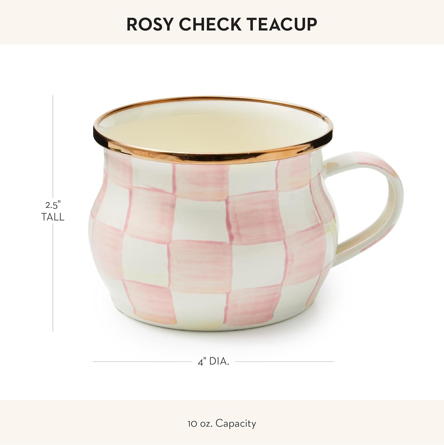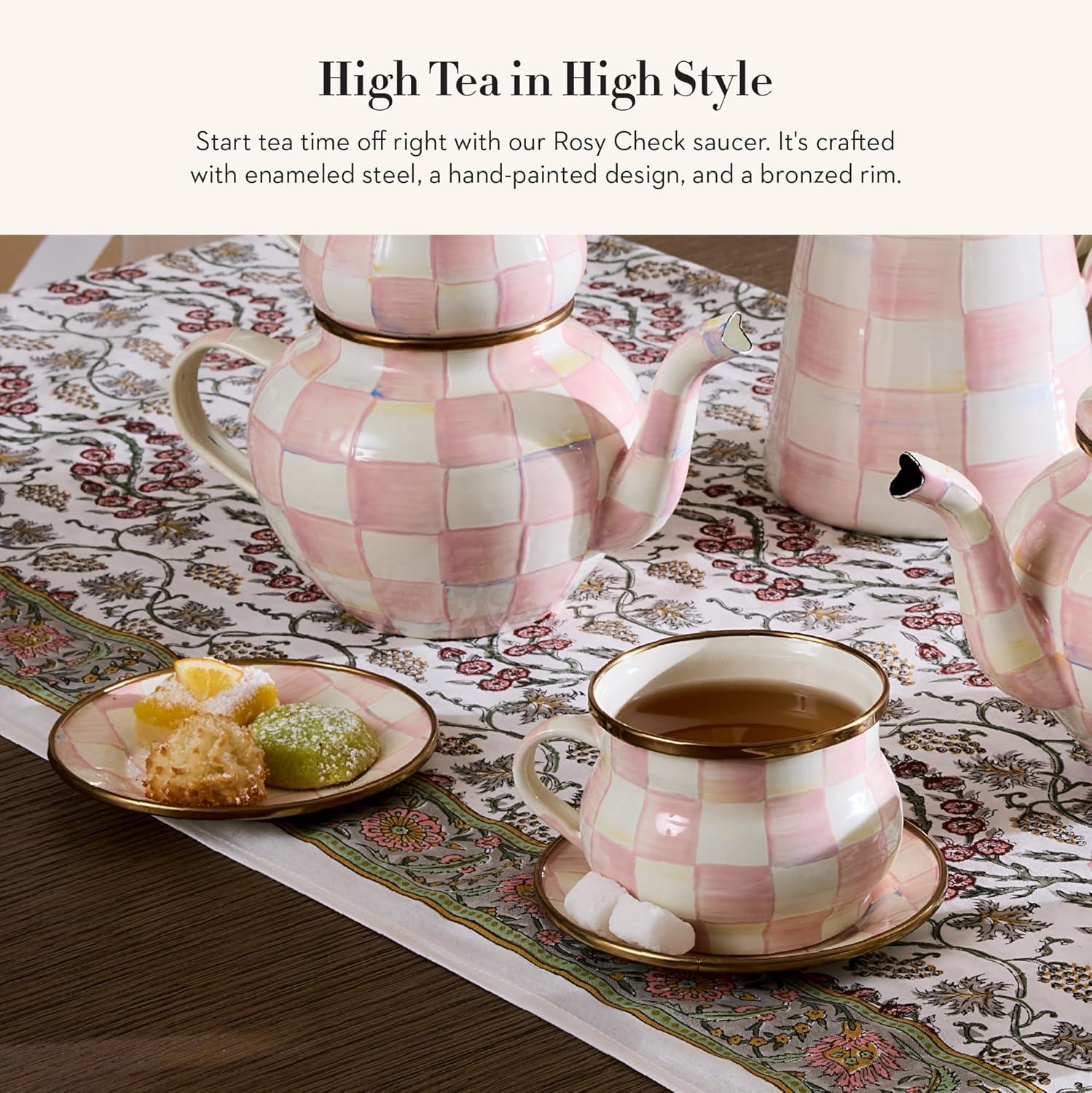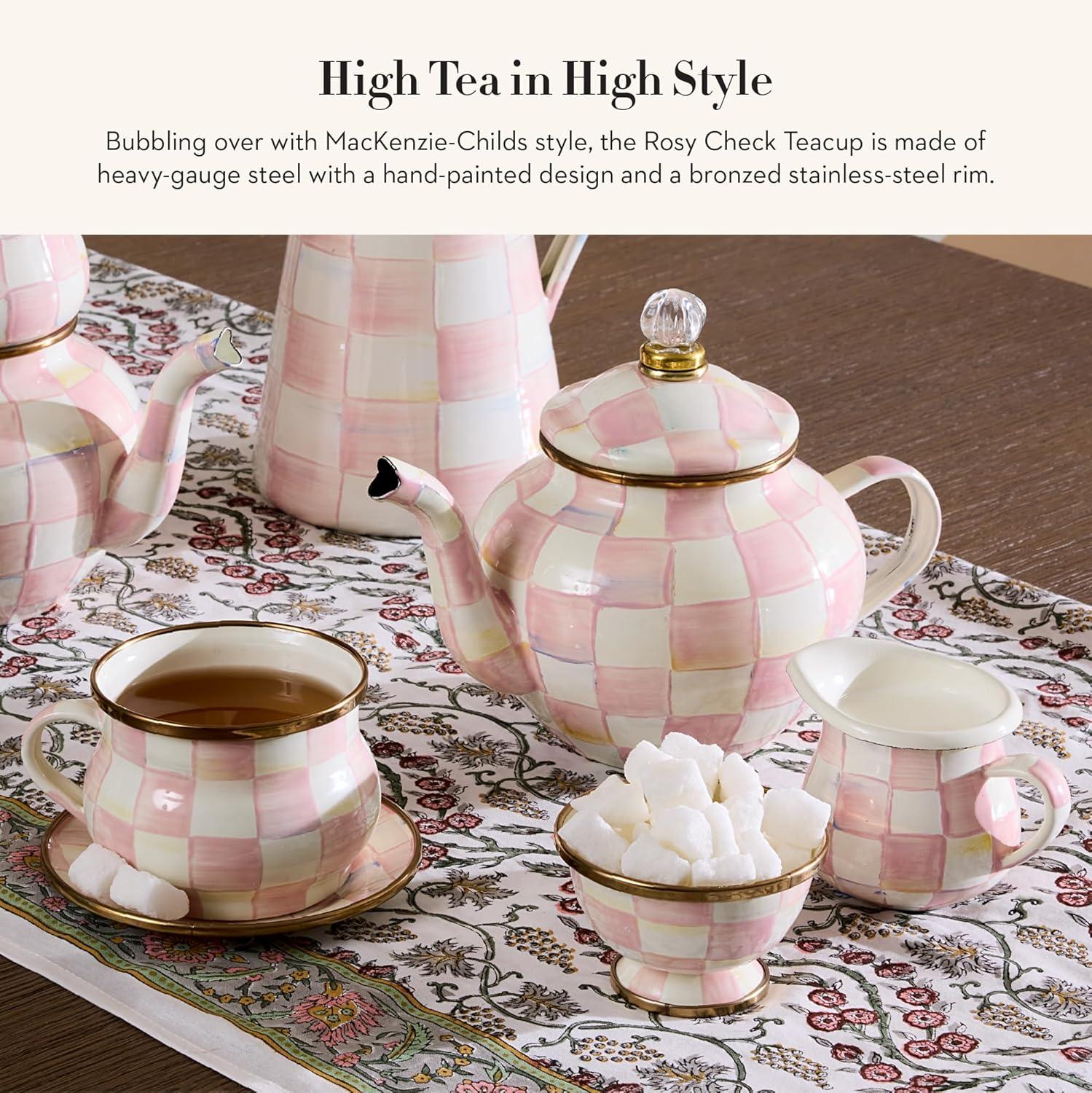 MACKENZIE-CHILDS Enamel Teapot, Cute Small Teapot with Lid, 4-Cup Capacity, Black-and-White Courtly Check(Rosy Check)