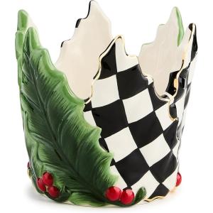 MACKENZIE-CHILDS Ceramic Pillar Candle Holder, Christmas Candle Dish, Short, Holly Leaf