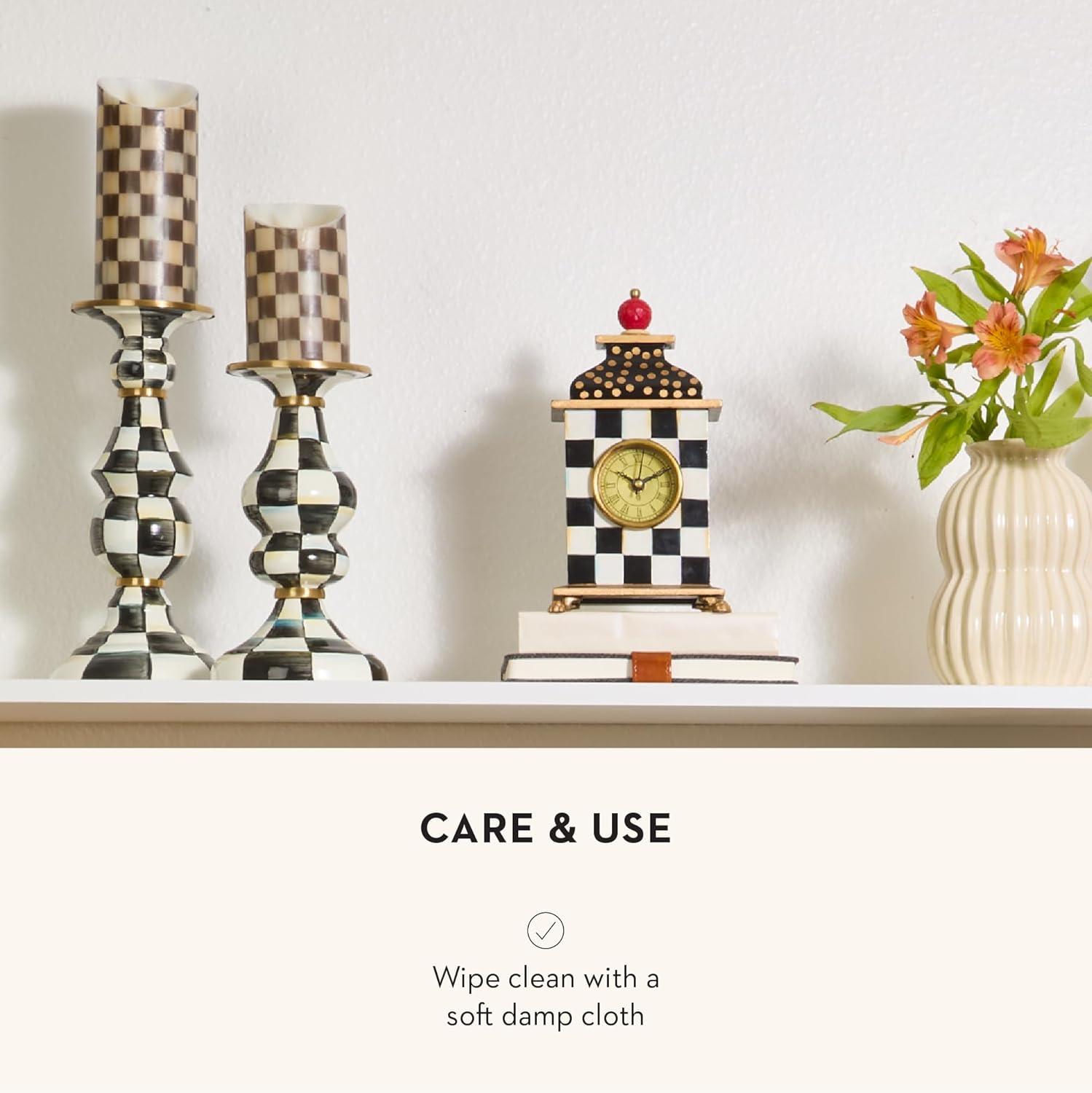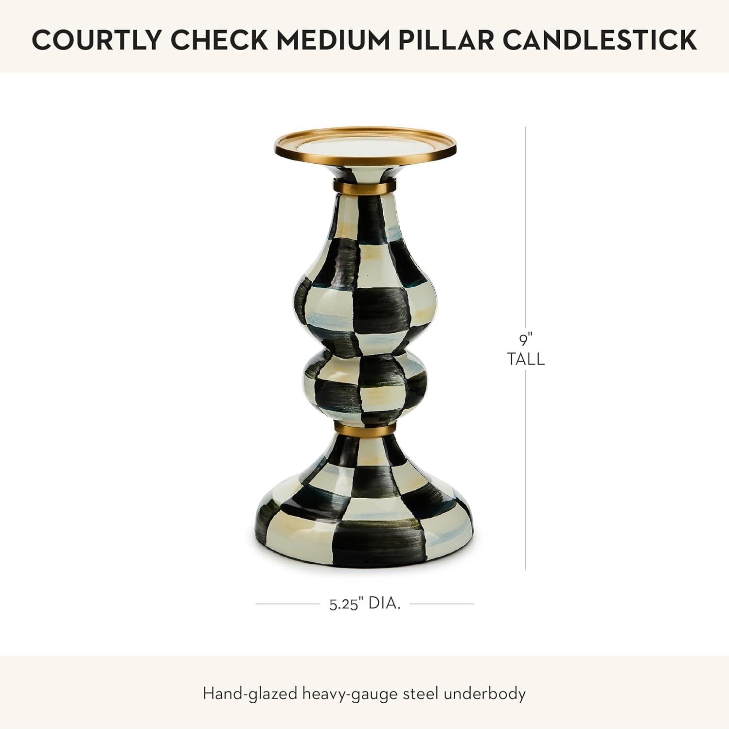 MACKENZIE-CHILDS Enamel Candlestick, Cute Candle-Holder Decor, Short, Brown-and-White Mocha Check(Emerald Check)