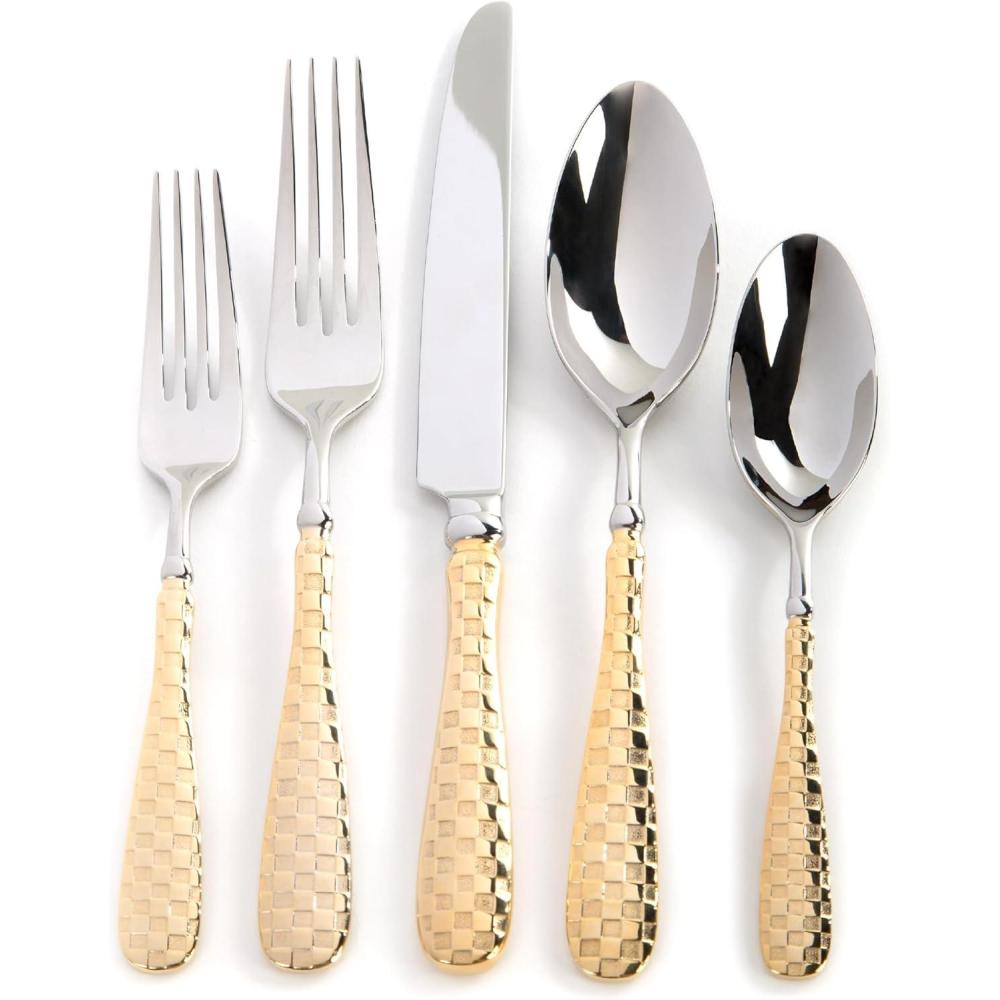 MACKENZIE-CHILDS 5-Piece Flatware Set, Cute Silverware Set with Salad Fork, Dinner Fork, Knife, Spoon, and Teaspoon, Gold Check(Gold Check)