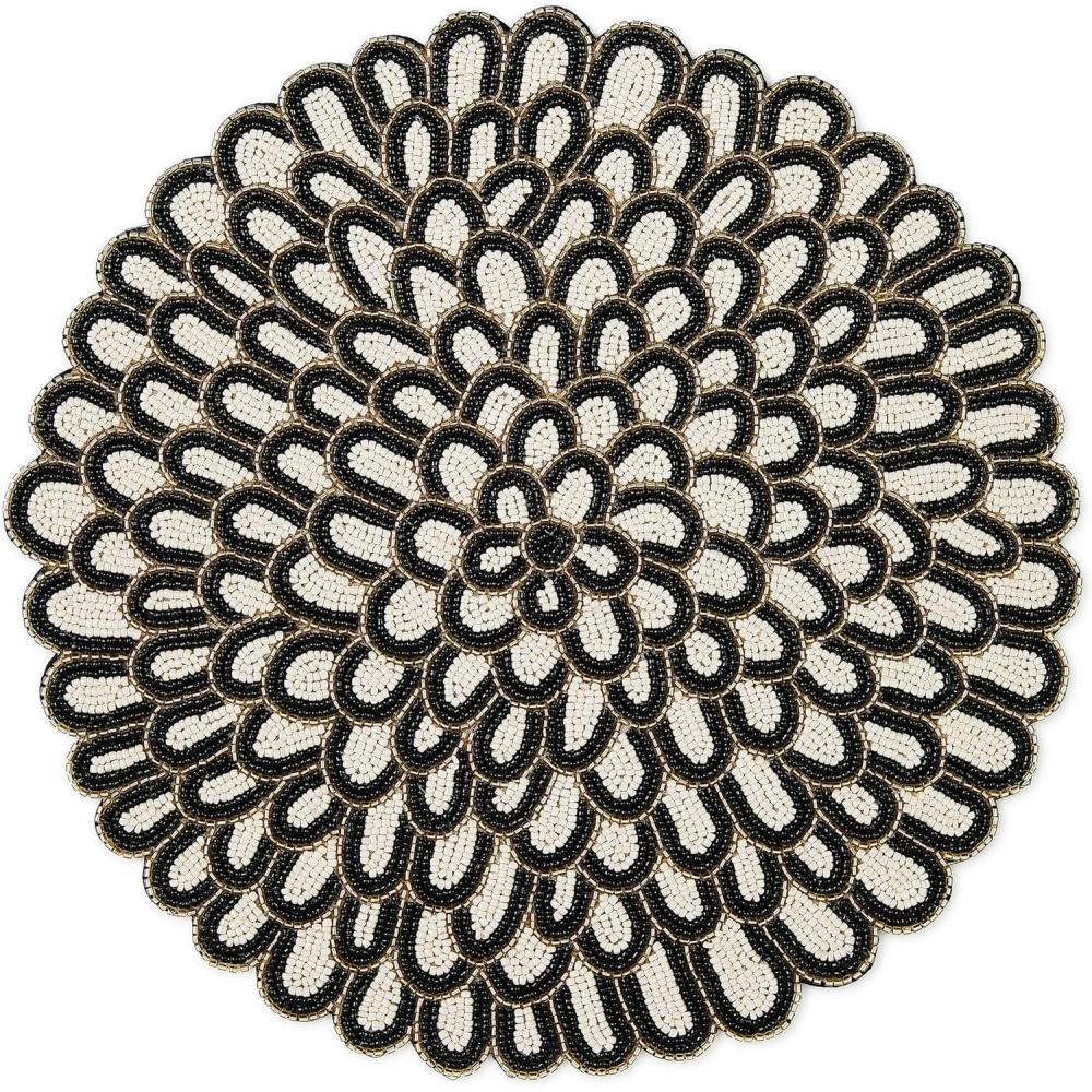 ELEGANT KITCHEN ESSENTIAL: Our Black-and-White Posie placemat is embellished in black-and-white beads that bloom out into an intricate floral pattern. Pair this kitchen table mat with matching dishes to set a lovely place at any dinner table.
