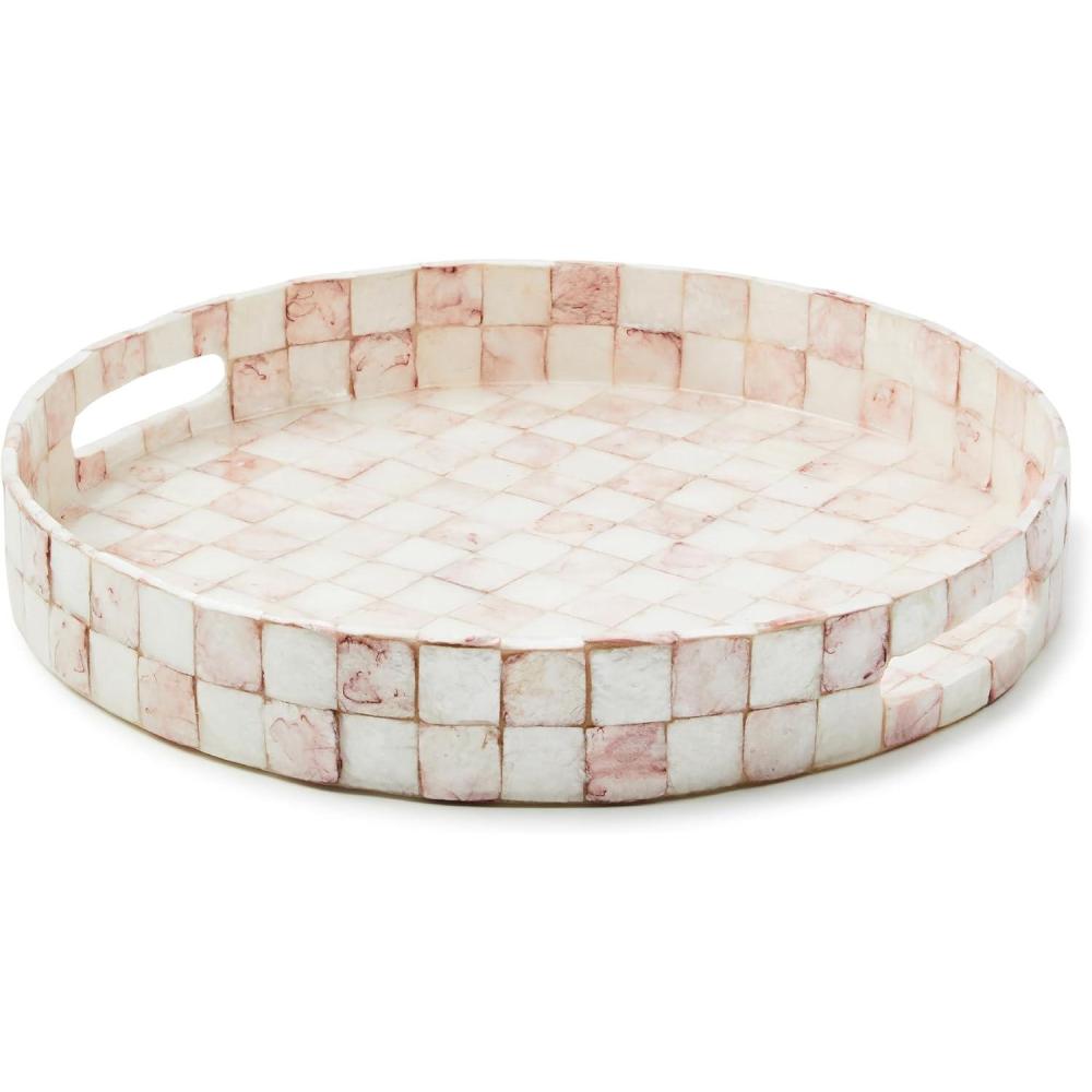 MACKENZIE-CHILDS Capiz Round Tray, Unique Serving Platter for Food and Drinks, Gray-and-White Sterling Check(Rosy Check)