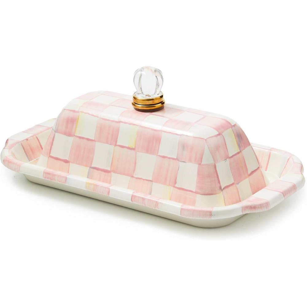MACKENZIE-CHILDS Enamel Butter Box, Cute Lidded Enamel Butter Dish, Brown-and-White Mocha Check(Rosy Check)