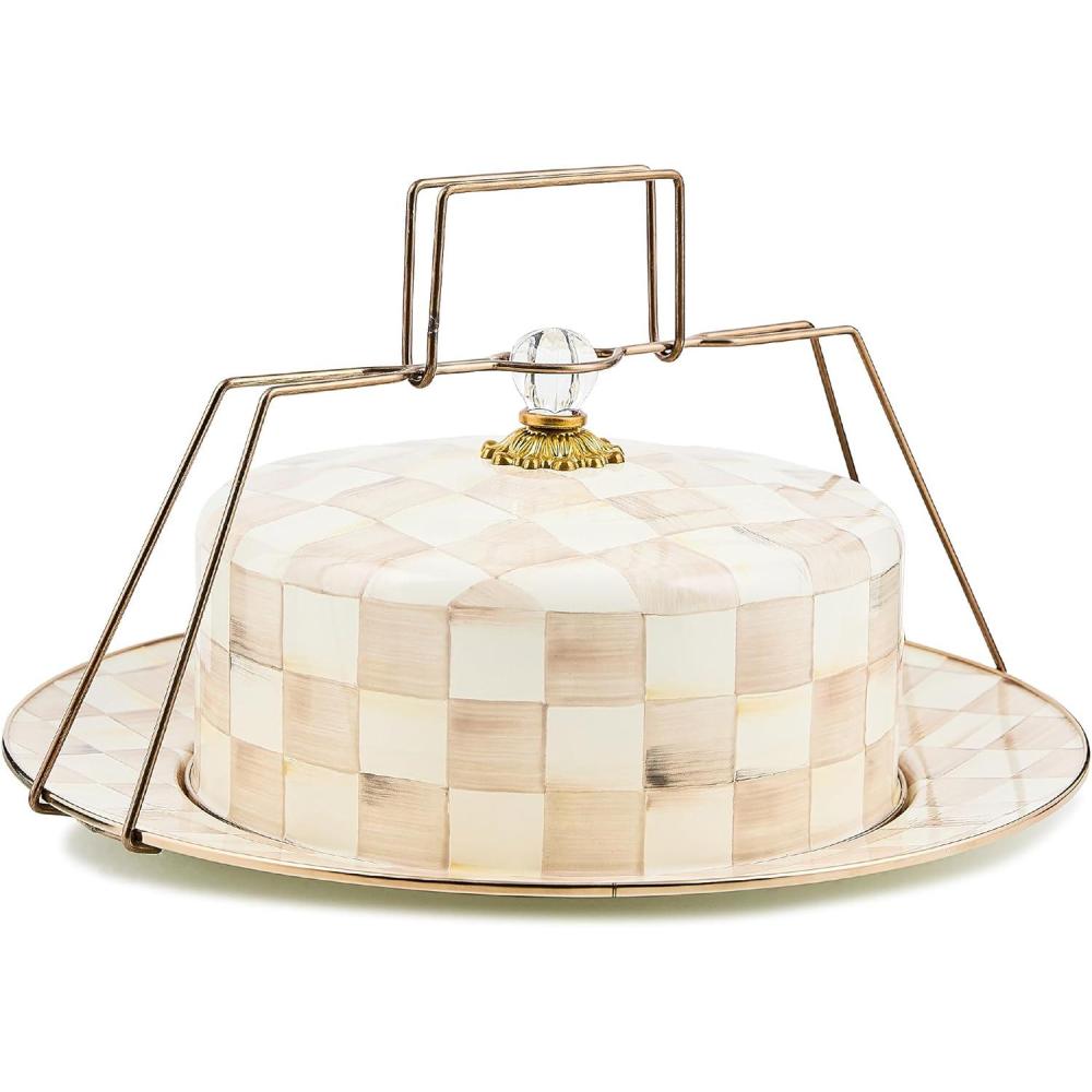 MACKENZIE-CHILDS Enamel Cake Carrier, Cake-Dish Serving Platter with Lid and Handles, Black-and-White Courtly Check(Mocha Check)