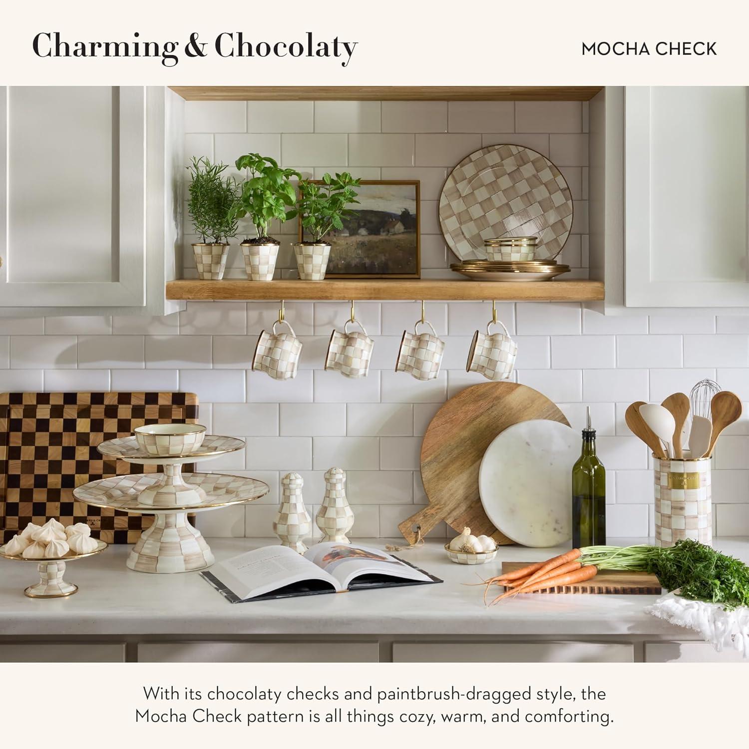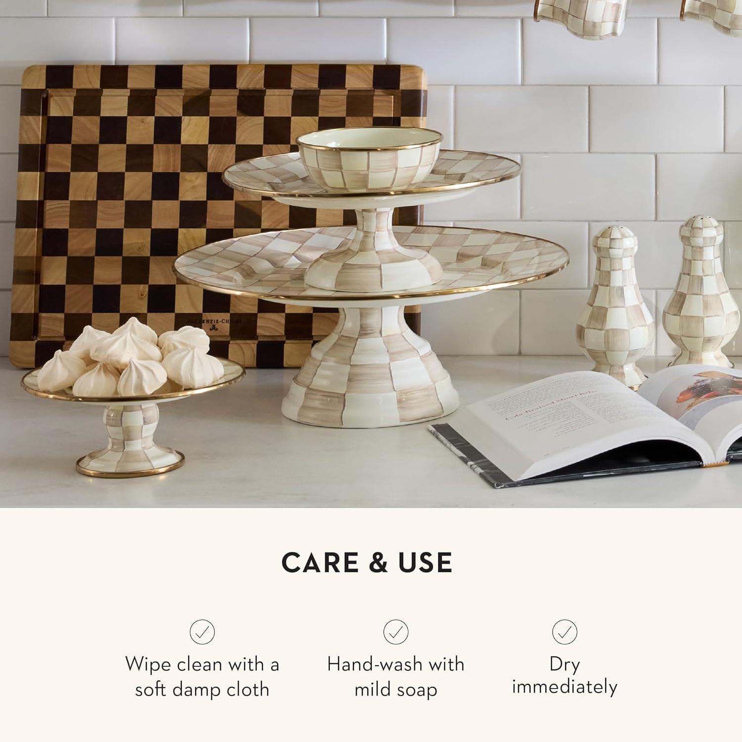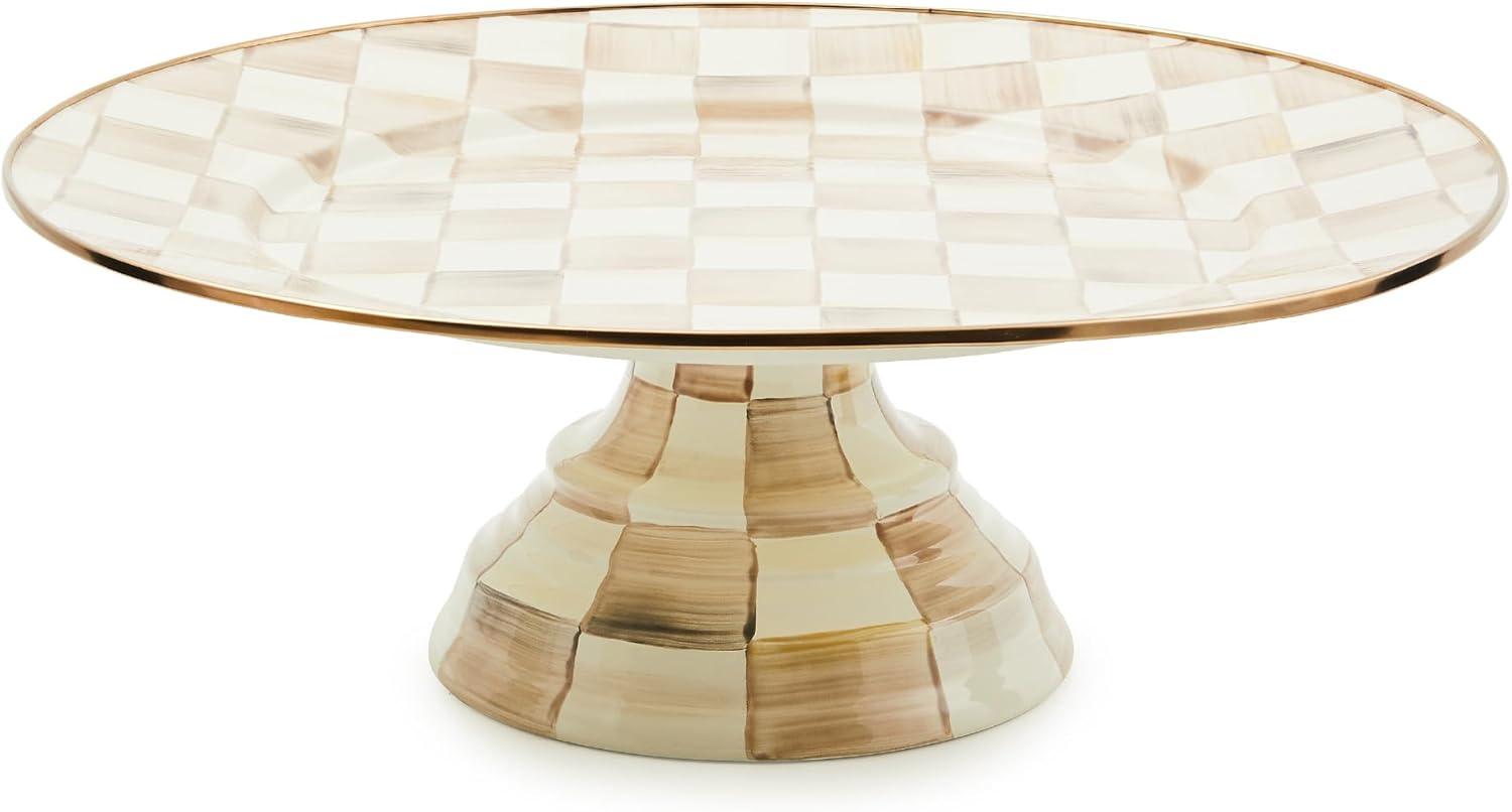 MACKENZIE-CHILDS Enamel Pedestal Platter, Round Cake Stand, Small, Gray-and-White Sterling Check(Mocha Check)