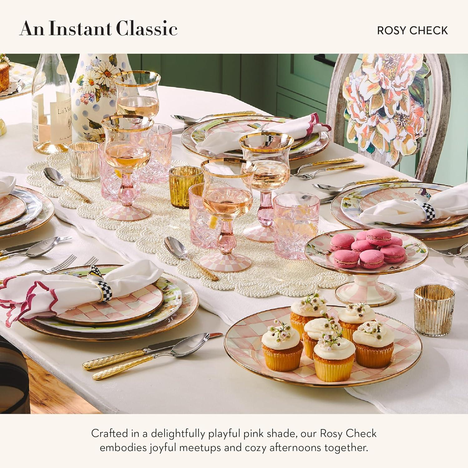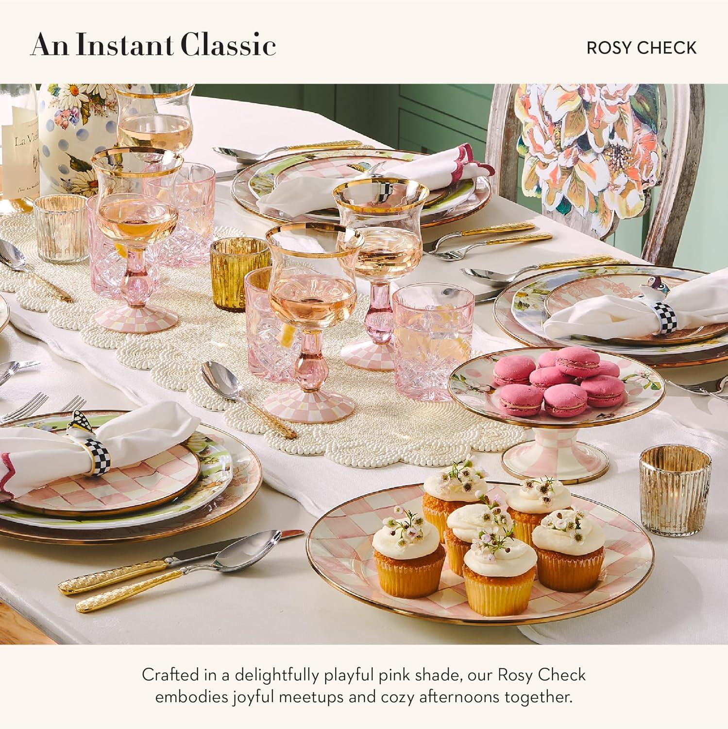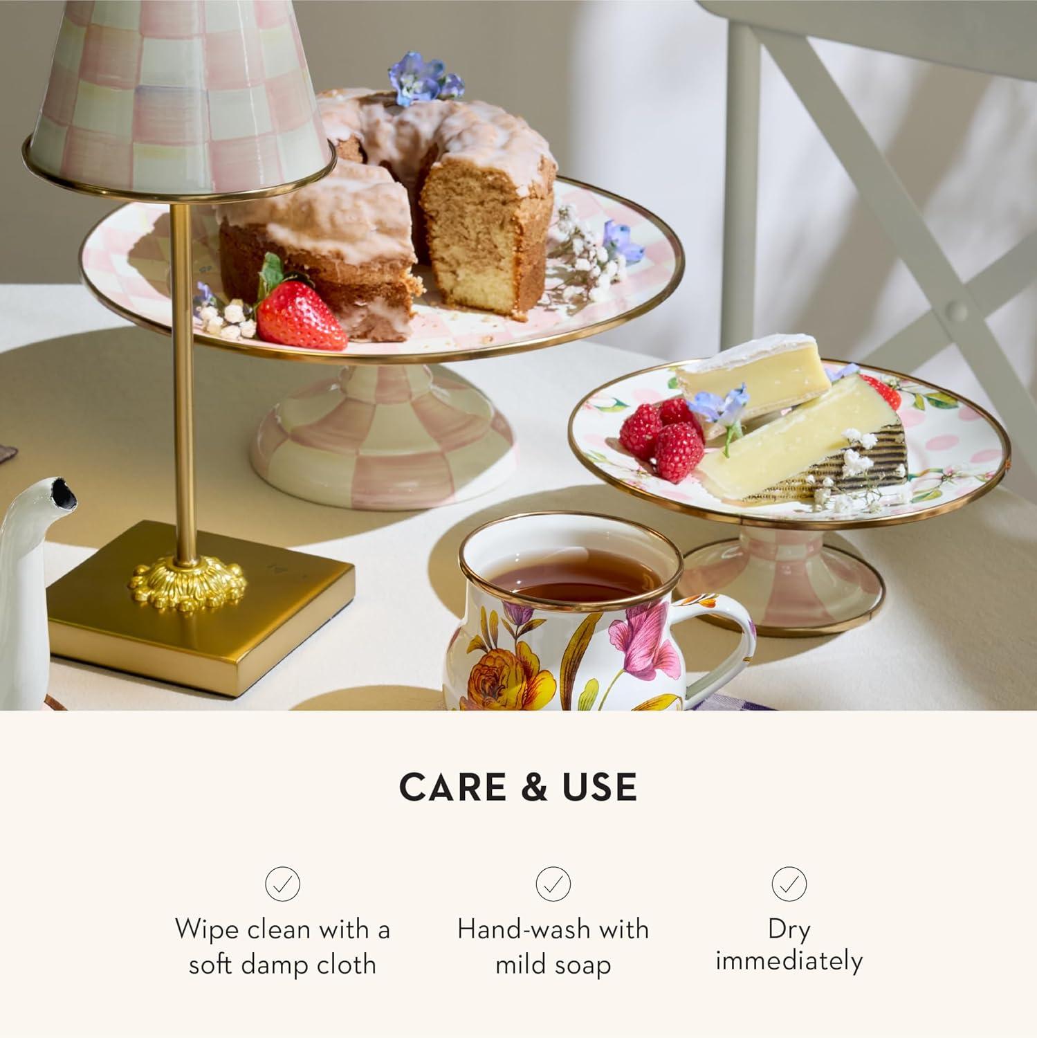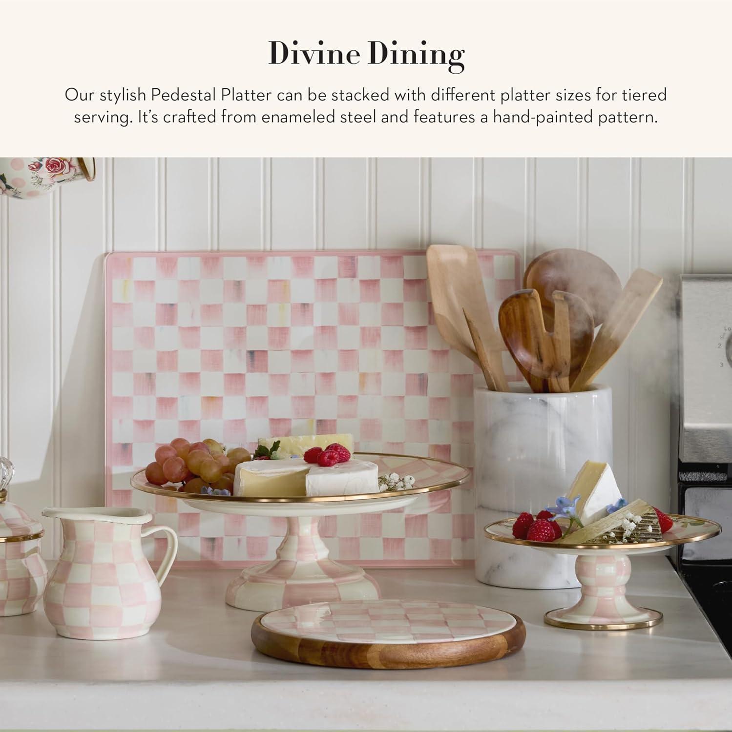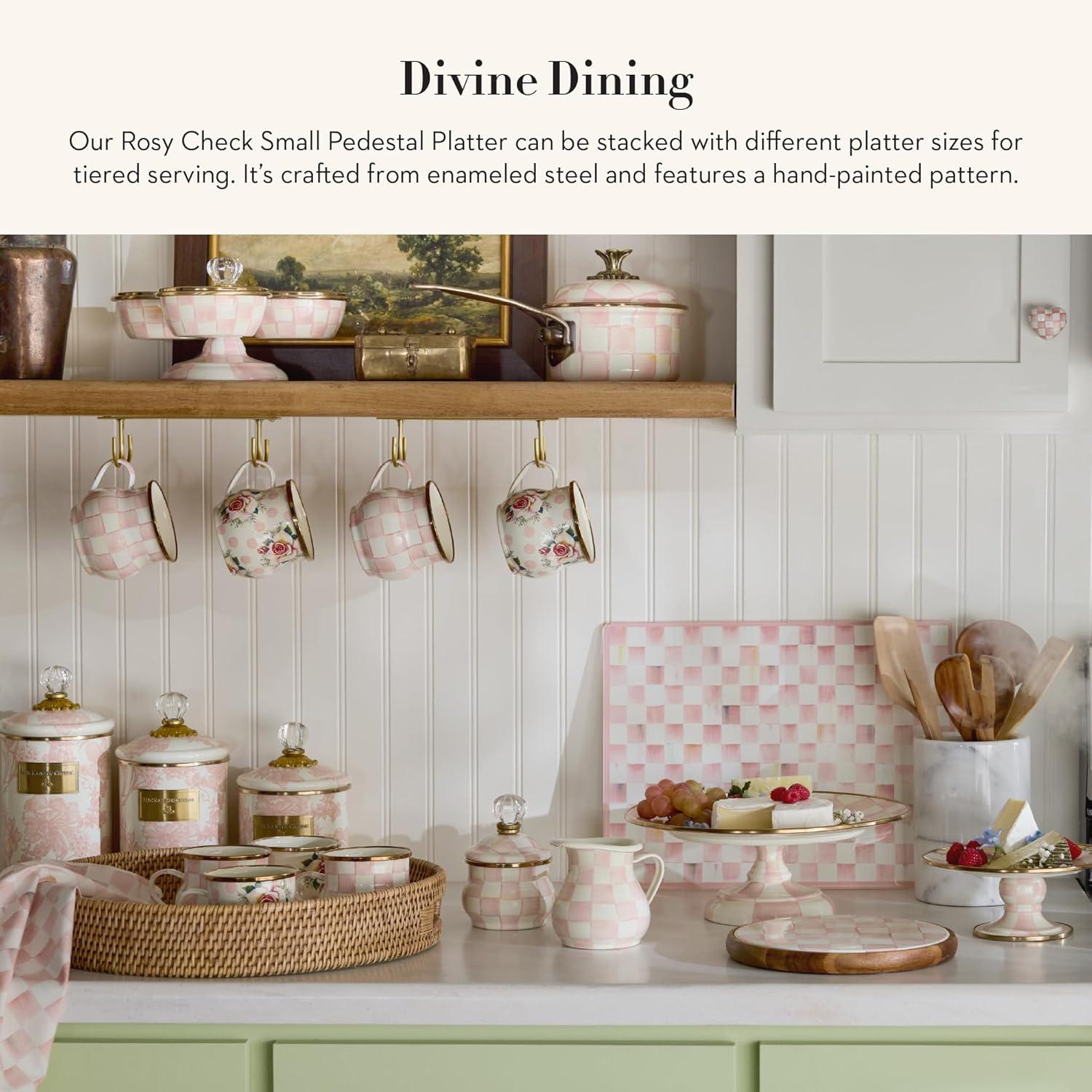 MACKENZIE-CHILDS Enamel Pedestal Platter, Round Cake Stand, Small, Gray-and-White Sterling Check(Rosy Check)