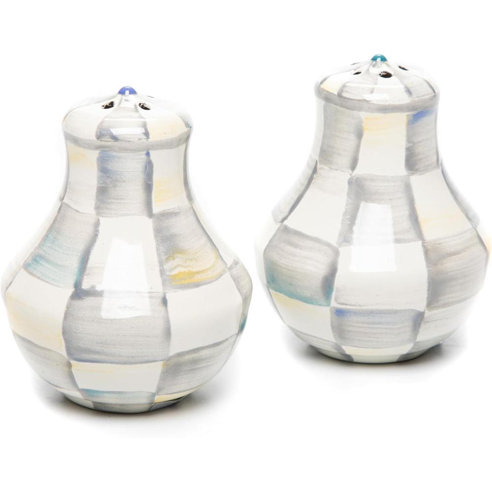 MACKENZIE-CHILDS Enamel Salt and Pepper Shakers, Kitchen Table Spice Shaker Set, Gray-and-White Sterling Check, Large(Black)