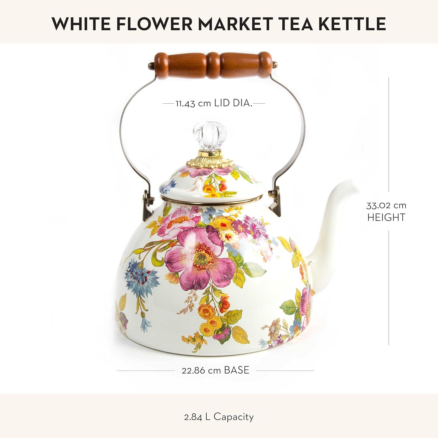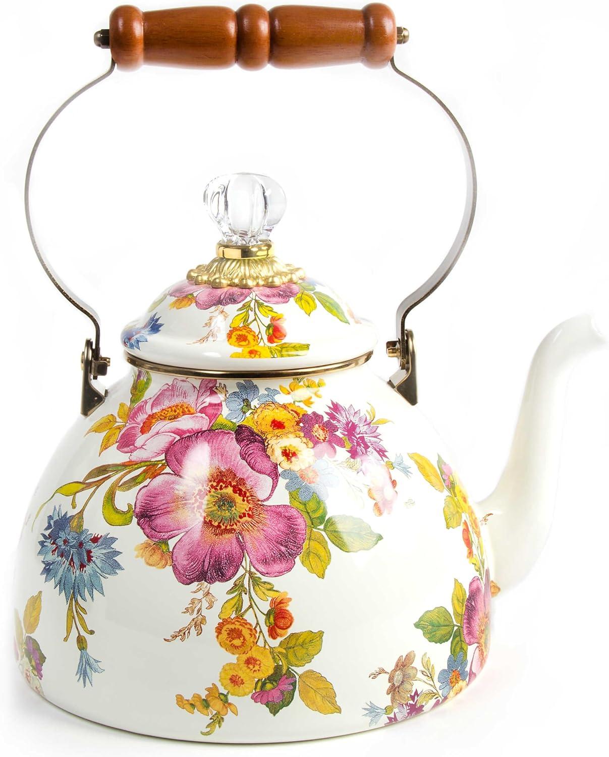 MACKENZIE-CHILDS Enamel Tea Kettle, Cute Tea Kettle for Stovetop, 2 Quarts, Wild Rose White(White Flower Market)