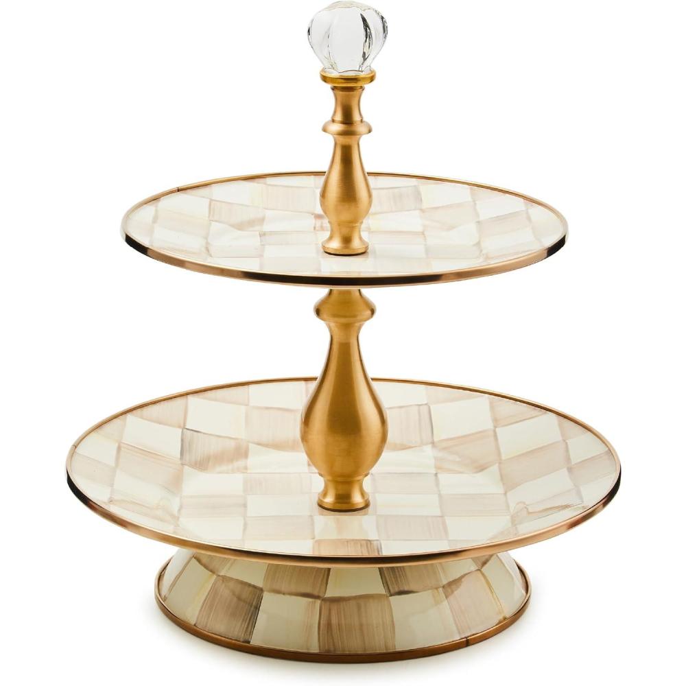 MACKENZIE-CHILDS Enamel Three-Tier Sweet Stand, Three-Tiered Serving-Tray Stand, Party Food Display, Black-and-White Courtly Check(Mocha Check)