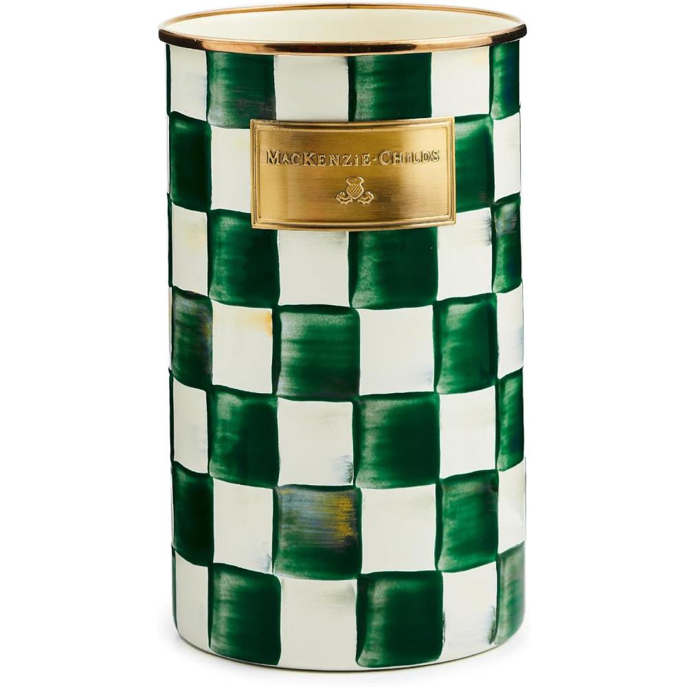 MACKENZIE-CHILDS Enamel Utensil Holder, Kitchen Utensil Holder for Countertop, Brown-and-White Mocha Check(Emerald Check)