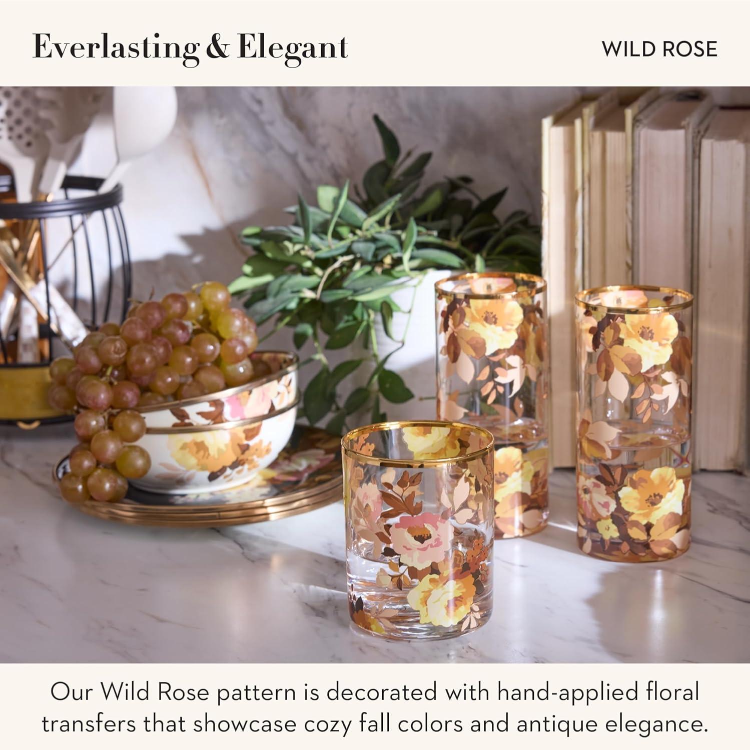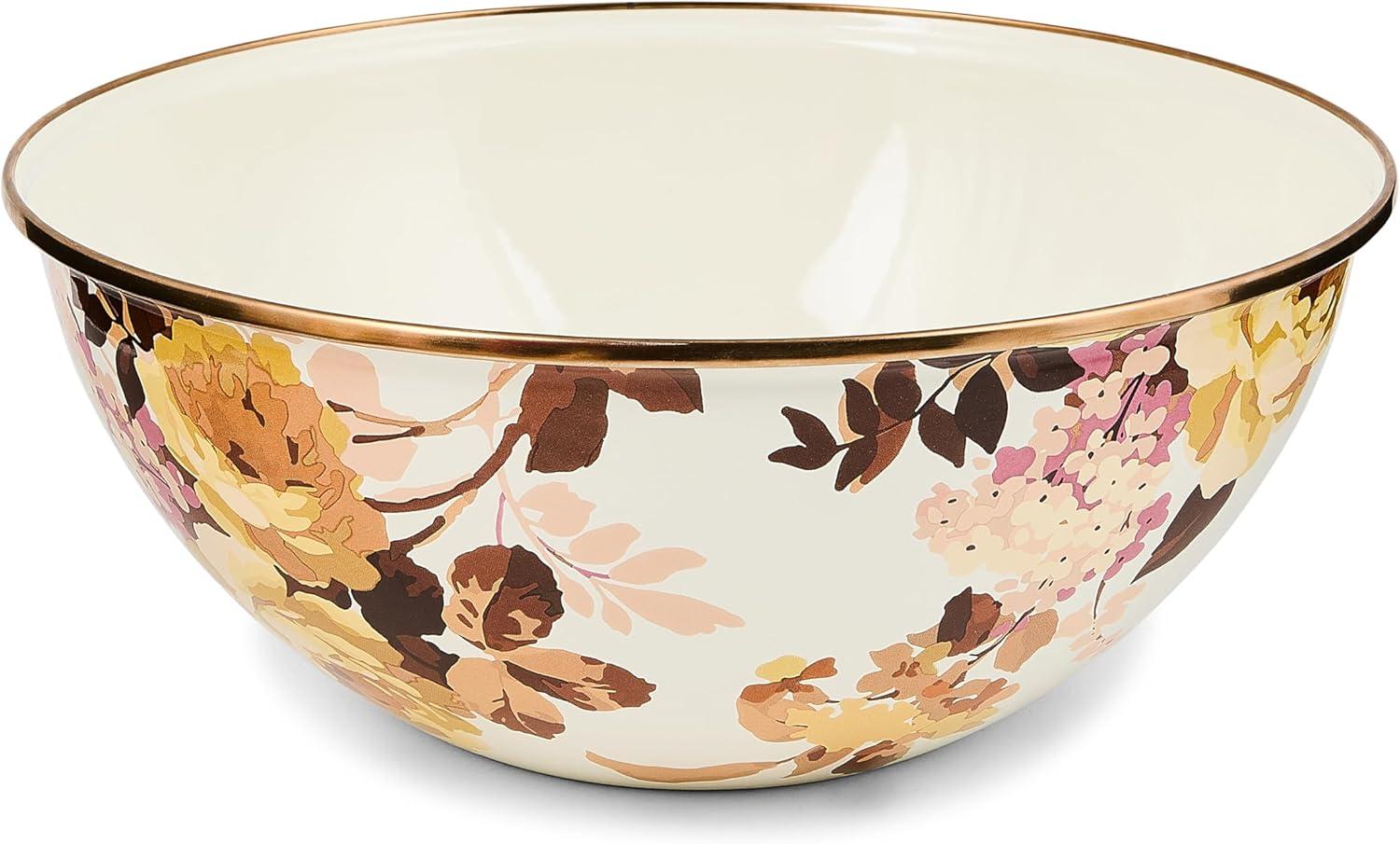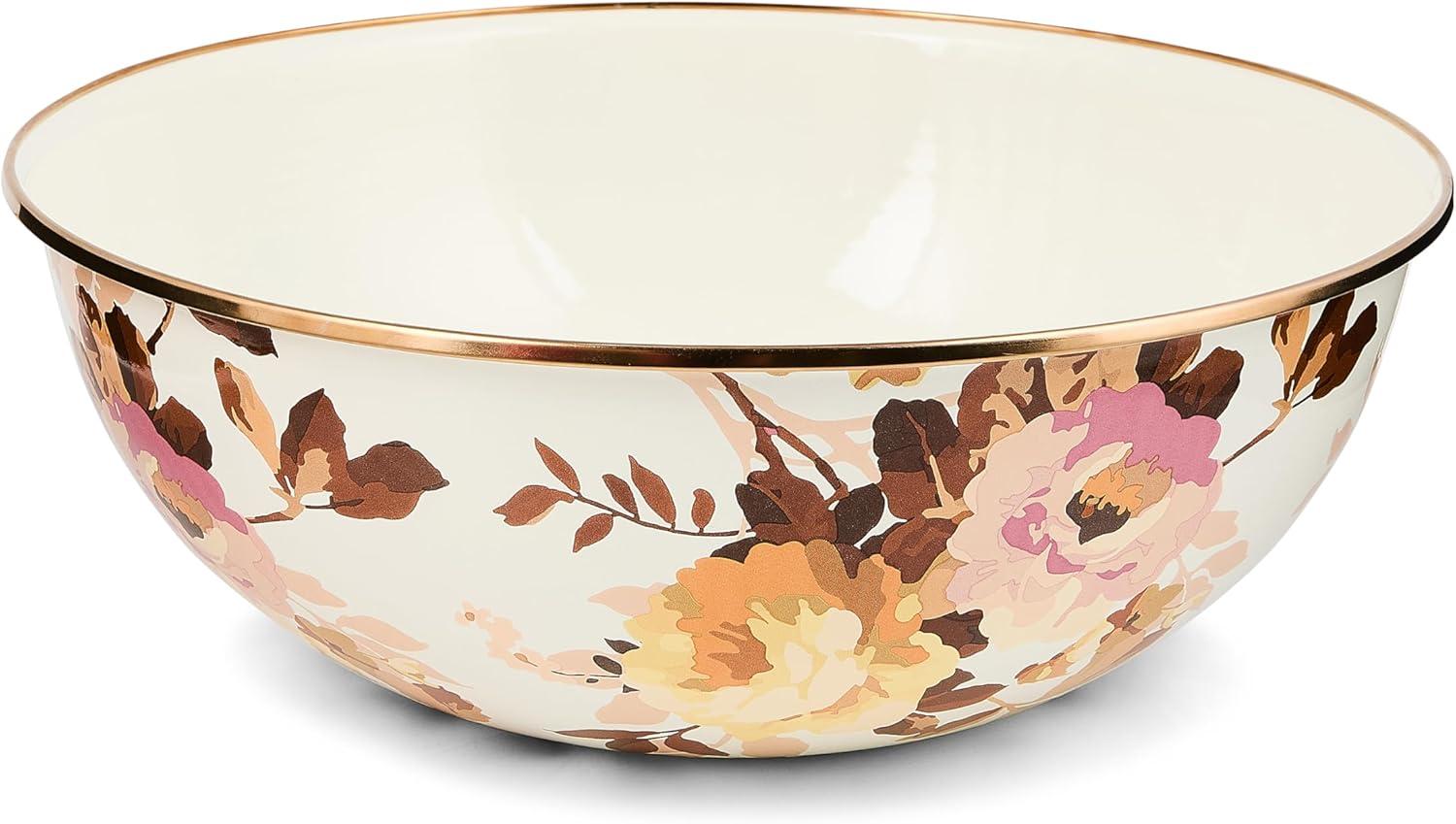 ENTERTAINING ESSENTIAL: Elevate meals with this bowl’s Wild Rose White pattern, featuring hand-applied cream, yellow, and pink floral transfers on a light background. It has a hand-glazed steel underbody with an elegant bronzed rim.