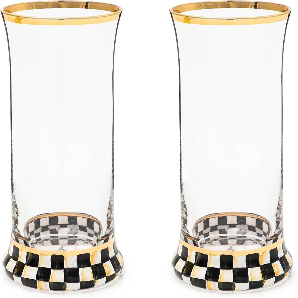MACKENZIE-CHILDS Highball Glasses, Tall Drinking Glasses with Gold Rims, 15 Ounces, Set of 2, Go Fish(Courtly Check)