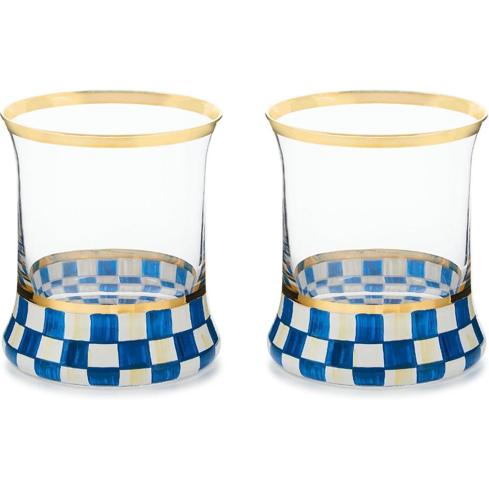 MACKENZIE-CHILDS Set of 2 Tumblers, Glass Drinkware with Gold Rims, 8 Ounces, Deck the Halls(Royal Check)