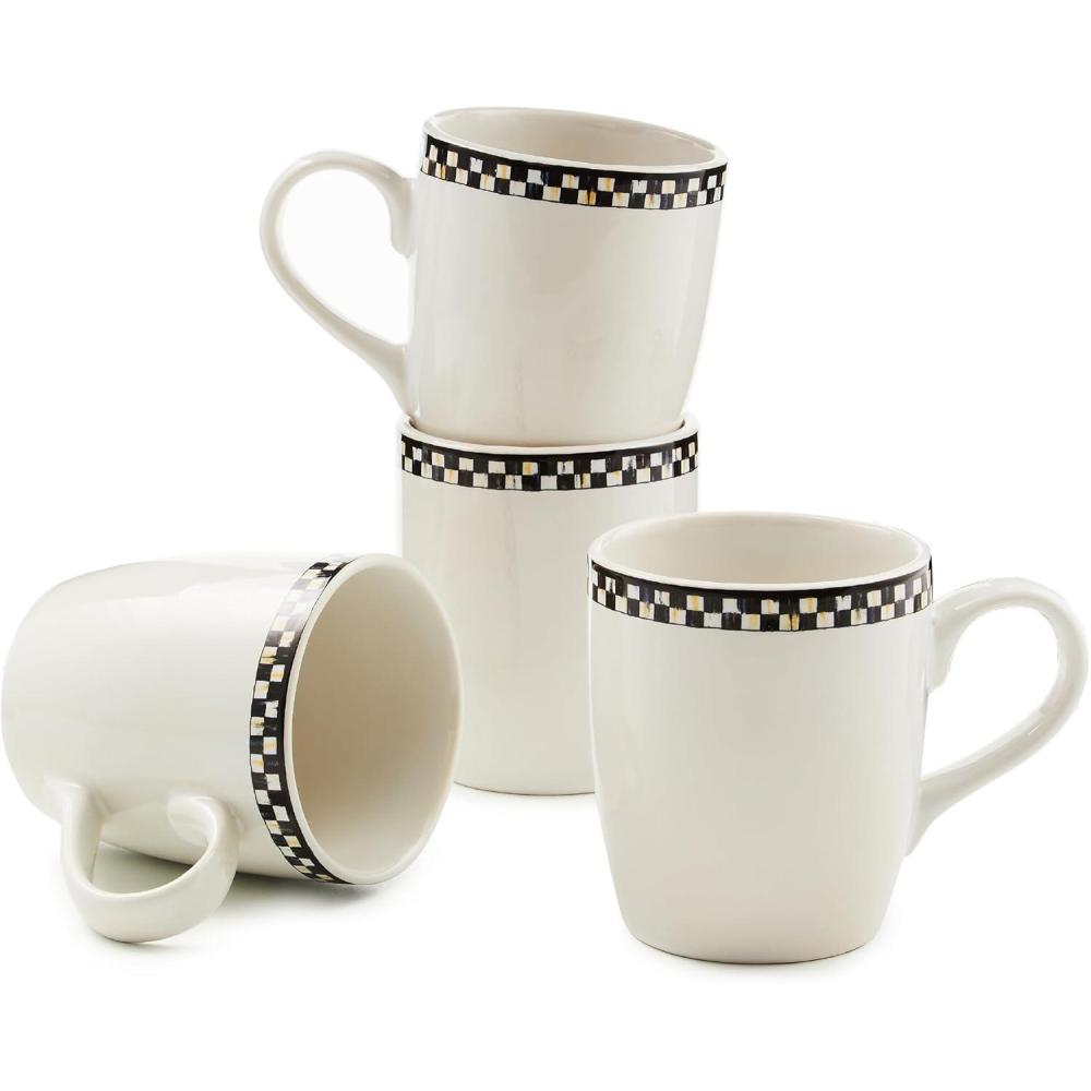 MACKENZIE-CHILDS Set of 4 Everyday Mugs, Dishwasher-Safe and Microwave-Safe, 14-Ounce Capacity, Black-and-White Courtly Check