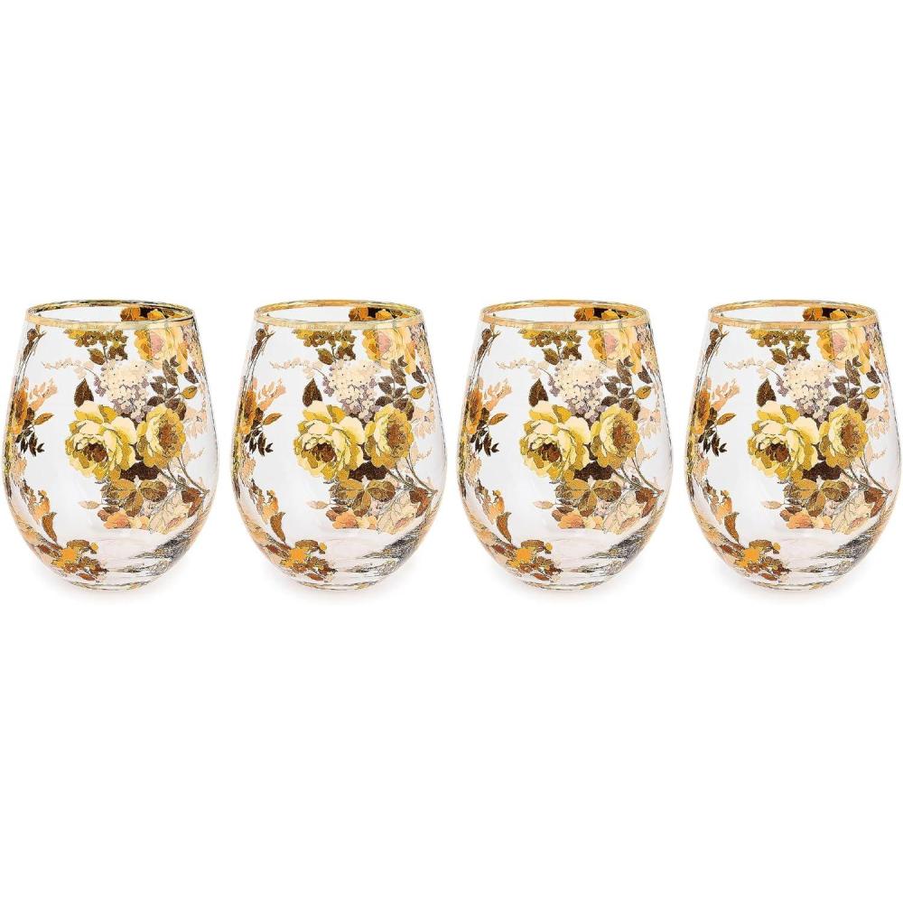 ELEGANT GLASSWARE: Our Wild Rose Stemless Wine Glasses feature a colorful hand-applied floral transfer of creamy brown garden flowers accented by gold luster embellishments. This glassware comes in a set of 4,and each glass has a 22-ounce capacity.