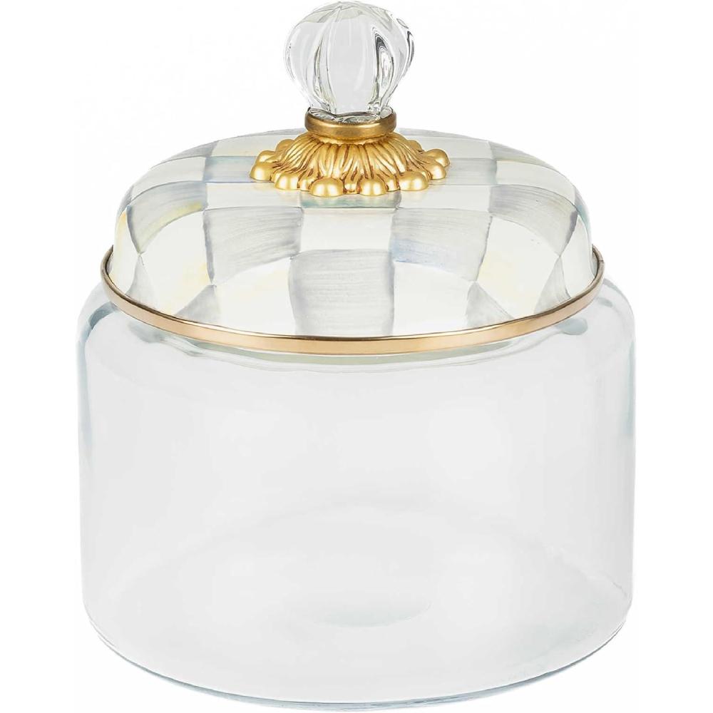 MACKENZIE-CHILDS Small Kitchen Canister, Decorative Glass Storage Jar with Lid, Green-and-White Emerald Check(Sterling Check)