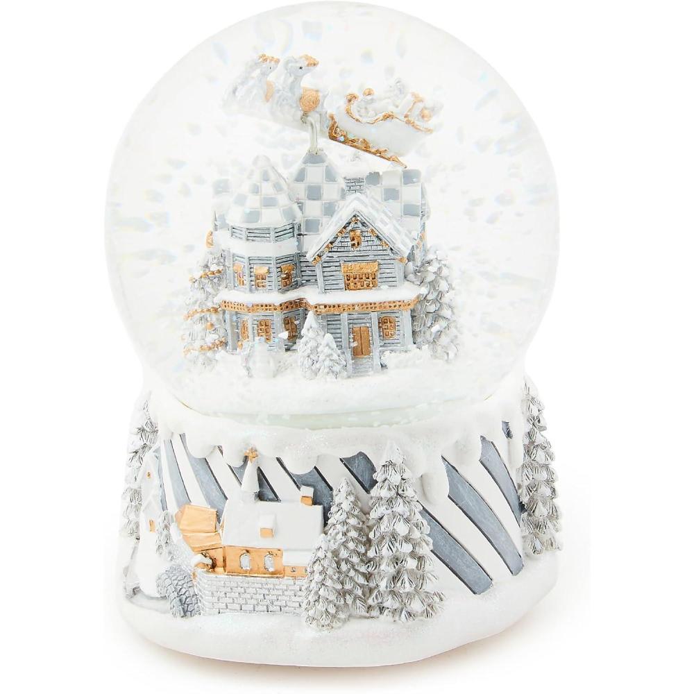 MUSICAL SNOW GLOBE: The unique MacKenzie-Childs Christmas snow globes let it snow with style. Each snow globe is also a music box that plays a festive holiday song. Place one among your living-room bookcase decorations or atop your office desk to brighten the season.