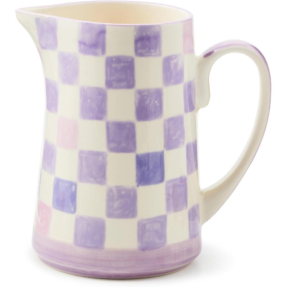 MACKENZIE-CHILDS Stoneware Pitcher with Spout, Decorative Drink Pitcher, 1.75 Quarts, Black Check(Lilac)